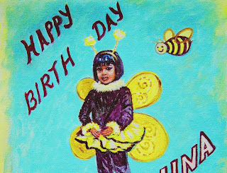 I painted the portrait of the birthday girl in this 'big card'. She is dressed in her ' Bumble Bee' dress with wings et al.